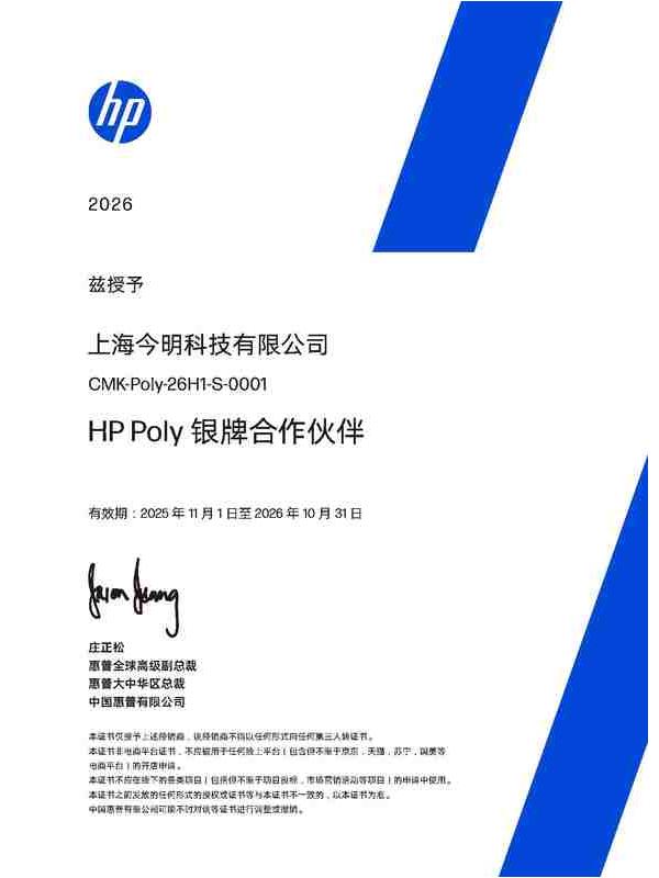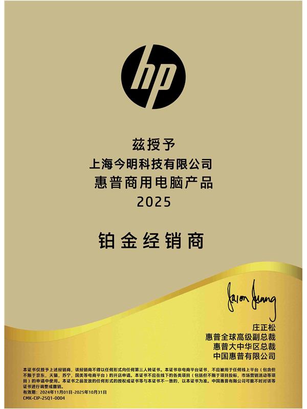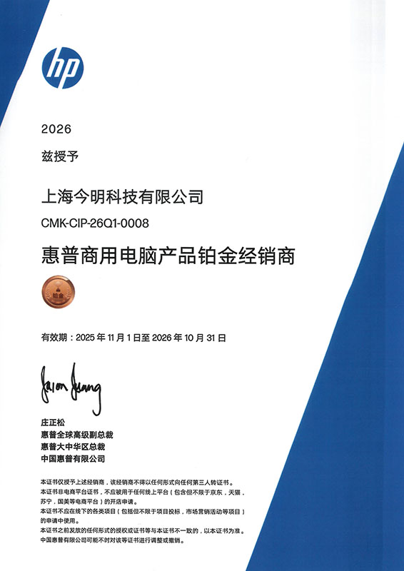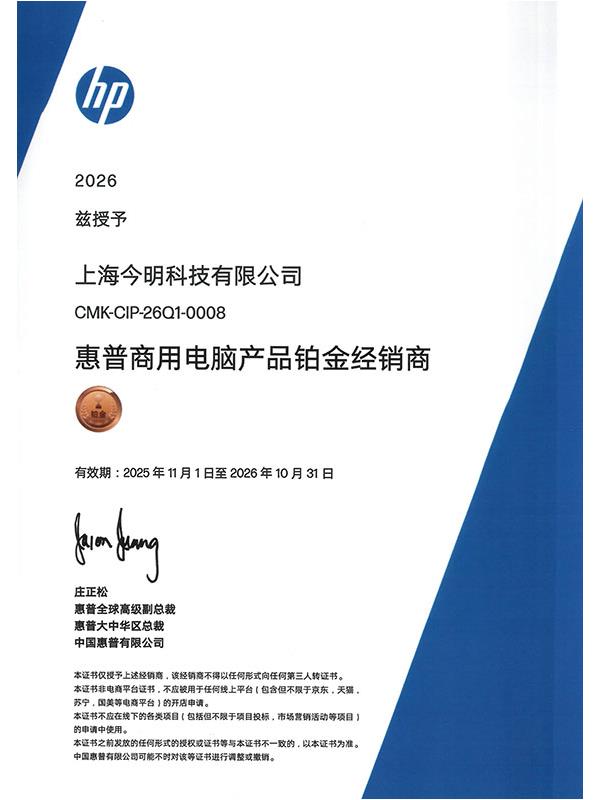 惠普商用電腦產(chǎn)品鉑金經(jīng)銷(xiāo)商證書(shū)-今明科技2026
